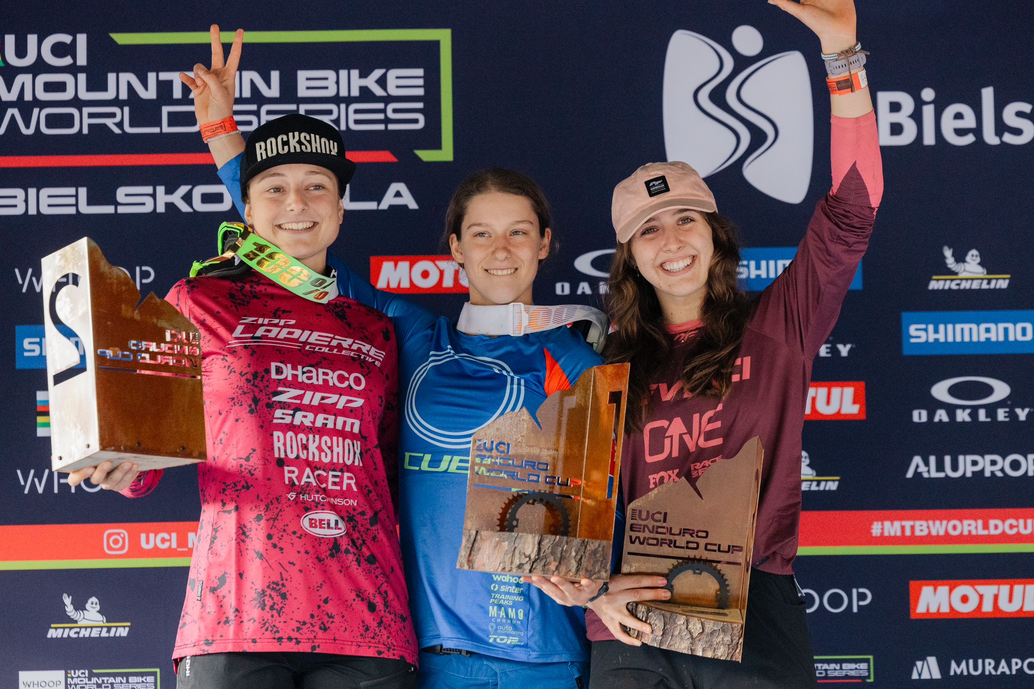 Unlike last week, where Harnden had enough of an advantage to take it easy on the final stage, the gloves were off in Bielsko-Biała, and riders threw caution to the wind. It was Courdurier who landed the winning blow, the experienced rider showing why she won four of last season’s seven UCI Enduro World Cups and improving on her second place in Finale. It wasn’t to be two-from-two for Harnden, who lost more than two seconds to Courdurier on the stage to finish just 0.236 seconds behind in the overall, while Taylor settled for third, Charles fourth and Conolly fifth.