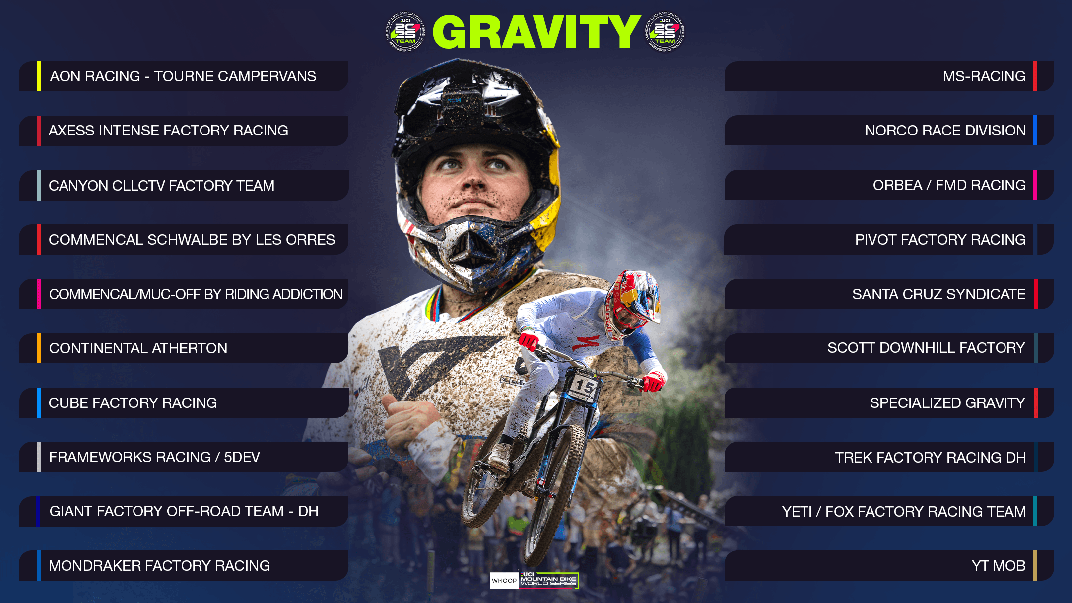 With the announcement of the WHOOP UCI Mountain Bike World Series Teams, Warner Bros. Discovery (WBD) Sports and the Union Cycliste Internationale (UCI) officially confirmed the Gravity teams that have secured top-tier status for the 2025 season. We focus on the 20 teams selected for all rounds of the UCI Downhill World Cup and UCI Enduro World Cup The 20-strong roster that will form the first division of Gravity racing in mountain biking has been confirmed, and it’s packed full of big factory teams, plucky underdogs and the most exciting talent from the worlds of Downhill and Enduro. As well as reigning WHOOP UCI Mountain Bike World Series overall winners and past and present rainbow jersey holders, the start list for every round will feature up-and-coming stars and legends of the sport. Simon Burney, Head of Sport for Cycling Events at WBD Sports Europe, said: “The introduction of the WHOOP UCI Mountain Bike World Series Team status ensures fans get to watch the best in the business battle it out at each round, and witness nail-biting racing where every hundredth of a second counts.” BIG NAMES AND EXCITING NEW ADDITIONS IN DOWNHILL FIELD With the UCI points of the four highest-ranked riders of each team determining the UCI team rankings, the 2024-2025 off-season transfers took on even greater importance. Top-ranked team Commencal/Muc-Off by Riding Addiction strengthened their already talented roster, adding the UCI Downhill World Champion Loris Vergier to a star-studded line-up which includes multiple UCI Downhill World Cup winners Myriam Nicole and Amaury Pierron. The Andorran manufacturer faced stiff competition for the top spot from YT Mob, who signed European Champion and UCI World Cup winner Andreas Kolb. The Austrian joins a team that already features the almost unstoppable and reigning WHOOP UCI Mountain Bike World Series overall winner (Women Elite - Downhill) Valentina Höll and UCI World Cup winner and reigning Irish National Champion Oisin O’Callaghan. Canyon CLLCTV Factory Team’s signing of 2024 UCI Downhill World Cup overall series runner-up Marine Cabirou meant that the German outfit was the only other team to break the 3,000-point barrier. The Frenchwoman will be hoping to go one better in 2025, as will new teammate Troy Brosnan, who edged Amaury Pierron to second in the overall standings last year as a result of his famous win in Mont-Sainte-Anne, Canada. The man to beat though remains 2024 WHOOP UCI Mountain Bike World Series overall winner (Men Elite - Downhill), Loïc Bruni, who will once again be flanked by Finn Iles and Jordan Williams in the Specialized Gravity Team. One rider who has shown he can get the upper hand over Bruni on his day is Ronan Dunne. The Bielsko-Biała UCI Downhill World Cup winner will once again line up for Mondraker Factory Racing, alongside Dakotah Norton and new teammate Greg Williamson. Elsewhere, veteran Danny Hart will be completing his 18th elite season as part of Norco Race Division. Trek Factory Racing DH meanwhile has a new-look squad fronted by Matt Walker and Lachlan Stevens-McNab. Some new teams also made the automatic WHOOP UCI Mountain Bike Series Team cut. Tahnée Seagrave has linked up with Spanish manufacturer Orbea to launch Orbea/FMD Racing and is joined by Martin Maes – the only rider on the circuit who has won a UCI Downhill World Cup and a UCI Enduro World Cup; while 2020 UCI Downhill World Champion Reece Wilson is spearheading one of the most interesting additions to the WHOOP UCI Mountain Bike World Series pits – AON Racing - Tourne Campervans. The Flying Scotsman isn’t going alone either, with Monika Hrastnik and UCI Enduro World Cup overall winner Harriet Harnden on board. Finally, Santa Cruz Syndicate just scraped into the automatic selection spots. The Steve Peat-managed outfit will be hoping for more successful seasons from Laurie Greenland, Nina Hoffmann and a fully recovered Jackson Goldstone. Other teams to secure the automatic WHOOP UCI Mountain Bike World Series Team status were Giant Factory Off-Road Team - DH, Commencal Schwalbe by Les Orres, Axess Intense Factory Racing, Frameworks Racing/5Dev and MS-Racing. ICONIC ATHLETES AND ENDURO OUTFITS CELEBRATE WILDCARD SPOTS The five season-long wildcard spots were all given to teams with previous experience at the WHOOP UCI Mountain Bike World Series and ensured that some of Downhill and Enduro’s biggest names would still be in the start hut at every Gravity round in 2025. The most established team was Scott Downhill Factory, which slipped to 16th in the rankings despite the points total of new signing and 2024 UCI Downhill World Cup winner in Loudenvielle-Peyragudes Benoît Coulanges. Continental Atherton was another name to celebrate the wildcard system after losing Andreas Kolb’s points. But with Rachel Atherton registered to ride, could we see the return of one of Downhill’s most iconic athletes to the podium this season? Two of the five wildcard spots were taken by teams with big ambitions. Richie Rude’s Yeti/Fox Factory Race Team is committing itself fully to Enduro and Downhill for 2025 and added 2020 UCI Downhill World Champion Camille Balanche to their 10 rider-strong line-up. Pivot Factory Racing will also dabble in both, with Morganne Charre hoping to add to her two UCI Enduro World Cup wins from 2024. Jess Blewitt and Max Hartenstern’s Cube Factory Racing secured the final wildcard spot. SHAKE UP IN ENDURO FAVOURITES FOR 2025 The WHOOP UCI Mountain Bike World Series Teams selections lean towards Downhill, but five teams will also be represented at UCI Enduro World Cup rounds. Fans can expect a shake-up in the favourites for 2025 though. That’s because the reigning WHOOP UCI Mountain Bike World Series overall Enduro winners Richie Rude (Yeti/Fox Factory Race Team) and Harriet Harnden (AON Racing - Tourne Campervans) are both set to focus on Downhill – opening the door for other riders to come to the fore. In the men’s f
