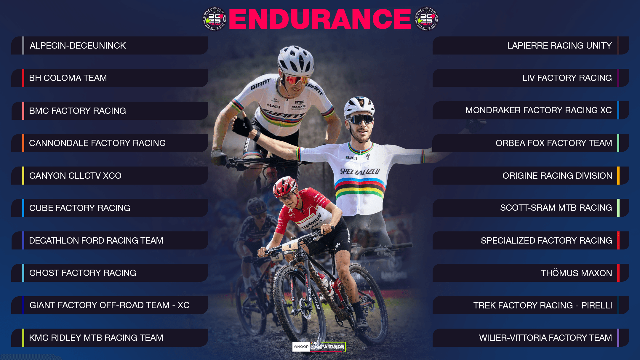 With the announcement of the WHOOP UCI Mountain Bike World Series Teams, Warner Bros. Discovery (WBD) Sports and the Union Cycliste Internationale (UCI) officially confirmed the Endurance teams that have secured top-tier status for the 2025 season. We focus on the 20 teams selected for all 10 rounds of the UCI Cross-country World Cup (UCI Cross-country Olympic World Cup – XCO – and UCI Cross-country Short-Track World Cup – XCC) Comprised of the top 15 ranked teams based on UCI points, along with five permanent wildcards, this roster of 20 teams forms the first division of endurance racing in mountain biking. Each team is guaranteed entry to all 10 Endurance rounds of the WHOOP UCI Mountain Bike World Series, which kicks off in Araxá, Brazil, on April 3, 2025. The selections confirm that the world’s best cross-country mountain bike riders will battle it out for supremacy again, with the teams of stars such as Alan Hatherly (Giant Factory Off-Road Team - XC), Alessandra Keller (Thömus Maxon), Victor Koretzky (Specialized Factory Racing), Mona Mitterwallner (Mondraker Factory Racing XC), Mathieu van der Poel and Puck Pieterse (Alpecin-Deceuninck) all guaranteed spots on the start line. Simon Burney, Head of Sport for Cycling Events at WBD Sports Europe, said: “The 20 Endurance teams that have secured WHOOP UCI Mountain Bike World Series Team status will guarantee that each round will be fiercely contested from the first pedal stroke to the last surge for the line.” ESTABLISHED OUTFITS AND NEW ADDITIONS AMONGST TOP-15 RANKED TEAMS Three-quarters of the WHOOP UCI Mountain Bike World Series Teams were selected based on their UCI team rankings, which were determined by the UCI points of the four highest-ranked riders of each team. Sat at the top of the rankings table was Specialized Factory Racing – the American manufacturer’s team retaining all of the star women riders (Haley Batten, Sina Frei and Laura Stigger) that helped secure the women’s team series overall in 2024, as well as UCI Cross-country Short Track (XCC) World Champion and reigning WHOOP UCI Mountain Bike World Series overall winner, Victor Koretzky (XCC – Men Elite) alongside American Continental XCO Champion, Chris Blevins. Alessandra Keller’s results (2024 WHOOP UCI Mountain Bike World Series overall winner - XCC and XCO – Women Elite) effectively secured Thömus Maxon’s place at the table, while UCI XCO World Champion Alan Hatherly’s move to Giant Factory Off-Road Team - XC contributed the lion’s share of the US outfit’s points tally. Despite winning the men’s team series overall last season, Hatherly’s old team Cannondale Factory Racing slipped in the rankings due to the South African and Simon Andreassen’s moves. But the British team did enough to secure WHOOP UCI Mountain Bike World Series Team status and will be led by Charlie Alridge and new signing Jolanda Neff. Andreassen’s UCI points bolstered Orbea Fox Factory Team’s total, and the Dane will be vying for wins to add to his collection for the Spanish manufacturer alongside fellow new addition Rebecca Henderson. Elsewhere, Scott-SRAM MTB Racing Team could count on the points of stalwarts Nino Schurter, Filippo Colombo and the addition of up-and-coming star of last season’s Under-23 category, Bjorn Riley. The American youngster will be one to watch in what will his first Elite season. Riley’s main rival in the Under-23 class, Riley Amos, is also taking the step up for 2025 and will be leading the charge for Trek Factory Racing - Pirelli alongside Evie Richards, while Canyon CLLCTV XCO is pinning its hopes on Luca Schwarzbauer and 2016 Olympic Champion Jenny Rissveds. It wasn’t just the established teams who made it into the top 15, with new outfit Origine Racing Division’s four-strong selection having enough points collectively to propel them into a WHOOP UCI Mountain Bike World Series Team spot. Led by UCI XCO World Cup podium finishers Mathis Azzaro and Martina Berta, the French team will be looking to make an instant impression. Other teams to secure the automatic WHOOP UCI Mountain Bike World Series Team status were BH Coloma Team, Decathlon Ford Racing Team, the Bart Brentjens-managed KMC Ridley MTB Racing Team, Wilier-Vittoria Factory Team, Ghost Factory Racing and Cube Factory Racing. STARS AMONGST WILDCARD SELECTIONS In addition to the top 15 ranked teams, five season-long wildcard spots were up for grabs for the remaining UCI Mountain Bike Teams. These have been assigned to the established outfits Alpecin-Deceuninck, BMC Factory Racing and Liv Factory Racing, and new teams Lapierre Racing Unity and Mondraker Factory Racing XC. Among members of these teams are multi-discipline stars Mathieu van der Poel and Puck Pieterse (Alpecin-Deceuninck), reigning French XCO National Champions Jordan Sarrou and Loana Lecomte (BMC Factory Racing), and three-time UCI Cross-country Marathon World Champion, Mona Mitterwallner (Mondraker Factory Racing XC). The full list of teams to secure WHOOP UCI Mountain Bike World Series Team status are: Alpecin-Deceuninck (BEL) BH Coloma Team (ESP) BMC Factory Racing (SUI) Cannondale Factory Racing (GBR) Canyon CLLCTV XCO (FRA) Cube Factory Racing (GER) Decathlon Ford Racing Team (FRA) Ghost Factory Racing (GER) Giant Factory Off-Road Team - XC (USA) KMC Ridley MTB Racing Team (NED) Lapierre Racing Unity (FRA) Liv Factory Racing (USA) Mondraker Factory Racing XC (ESP) Orbea Fox Factory Team (ESP) Origine Racing Division (FRA) Scott-SRAM MTB Racing Team (SUI) Specialized Factory Racing (USA) Thömus Maxon (SUI) Trek Factory Racing - Pirelli (USA) Wilier-Vittoria Factory Team (ITA