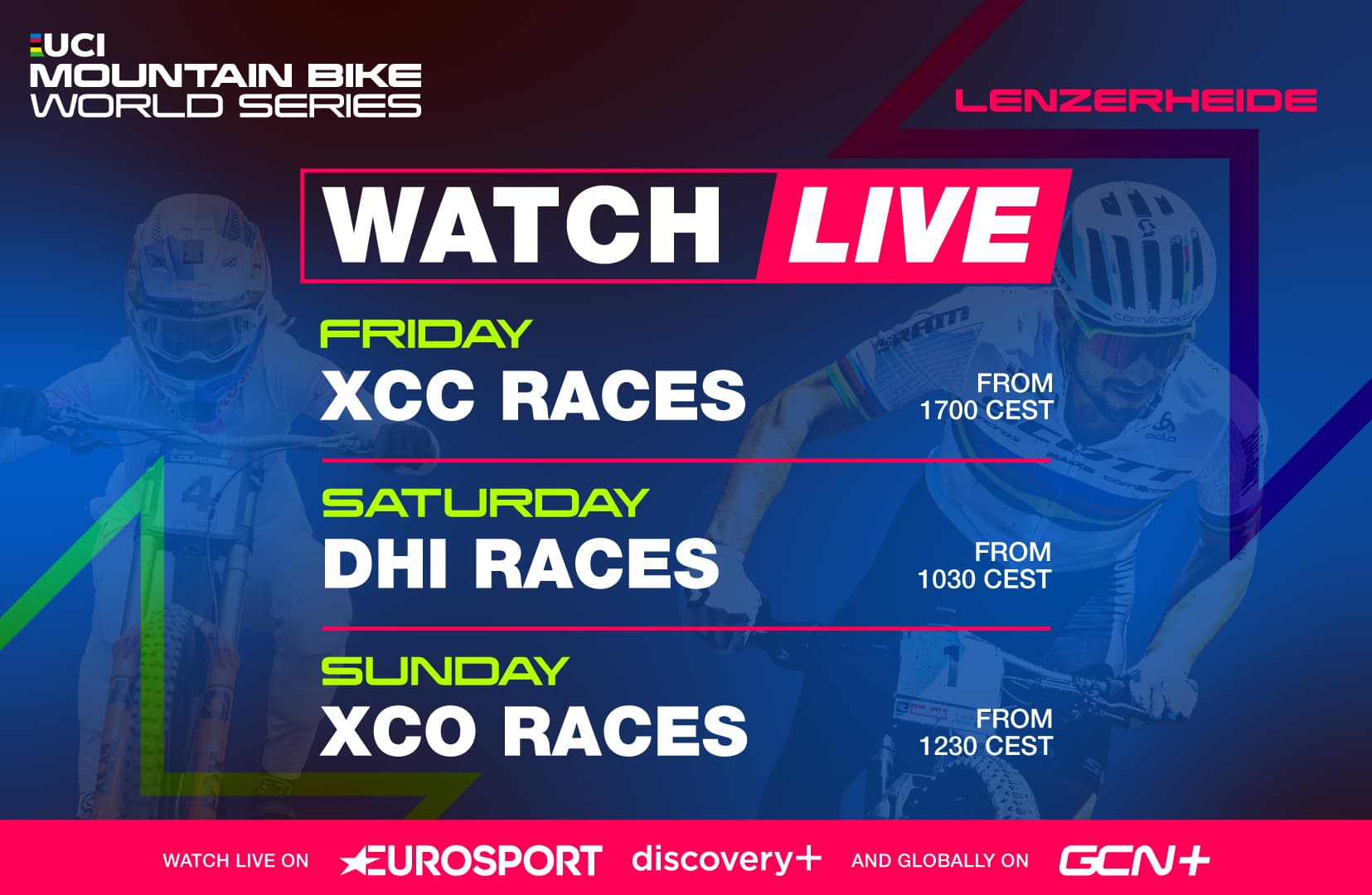 With the firepower of one of the world’s biggest sports broadcasters behind the UCI Mountain Bike World Series, there will be more live coverage and more ways to watch the UCI Mountain Bike Cross-country, Cross-country Short Track and Downhill World Cup in Lenzerheide. Friday 9 June Live on UCI Mountain Bike World Series YouTube channel:13.10 CEST UCI Mountain Bike Downhill World Cup - Junior Women13.55 CEST UCI Mountain Bike Downhill World Cup - Junior Men Live on Eurosport and discovery+, and globally on GCN+:17:00 CEST UCI Mountain Bike Short Track World Cup - Elite Women17:45 CEST UCI Mountain Bike Short Track World Cup - Elite Men Saturday 10 June Live on UCI Mountain Bike World Series YouTube channel:10:30 CEST UCI Mountain Bike Downhill World Cup - Elite Women Semi-Final11.15 CEST UCI Mountain Bike Downhill World Cup - Elite Men Semi-Final Live on Eurosport and discovery+, and globally on GCN+:12:45 CEST UCI Mountain Bike Downhill World Cup - Elite Women13.50 CEST UCI Mountain Bike Downhill World Cup - Elite Men Sunday 11 June Live on UCI Mountain Bike World Series YouTube channel:08:25 CEST UCI Mountain Bike Cross-country Olympic World Cup - U23 Women10:15 CEST UCI Mountain Bike Cross-country Olympic World Cup - U23 MenLive on Eurosport and discovery+, and globally on GCN+:12:30 CEST UCI Mountain Bike Cross-country Olympic World Cup - Elite Women15:00 CEST UCI Mountain Bike Cross-country Olympic World Cup - Elite Men Head to the UCI Mountain Bike World Series YouTube channel for post-event highlights, in-depth bike checks, course previews and exclusive behind the scenes content. Do you have what it takes to compete against the world’s best mountain bike race courses alongside the world’s best racers? Then you need to check out Open Racing for enduro and marathon riders Secure your place on the historic startlines of the Enduro of Chatel and the Marathon of Morzine during the UCI Mountain Bike World Series Festival, Haute-Savoie (September 7 - 17) and the Marathon of Snowshoe in the USA on September 27 - Oct 1. Swiss fans can also follow the racing for free on Swiss TV channel SRG SSR. Internationally you can follow via Claro in Latam, L’Equipe in France, Zhibo.tv in China, Supersport in Sub-Saharan Africa and Czech TV in the Czech Republic.